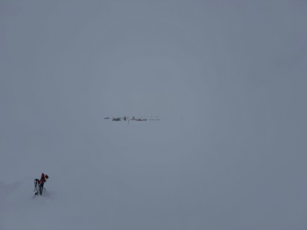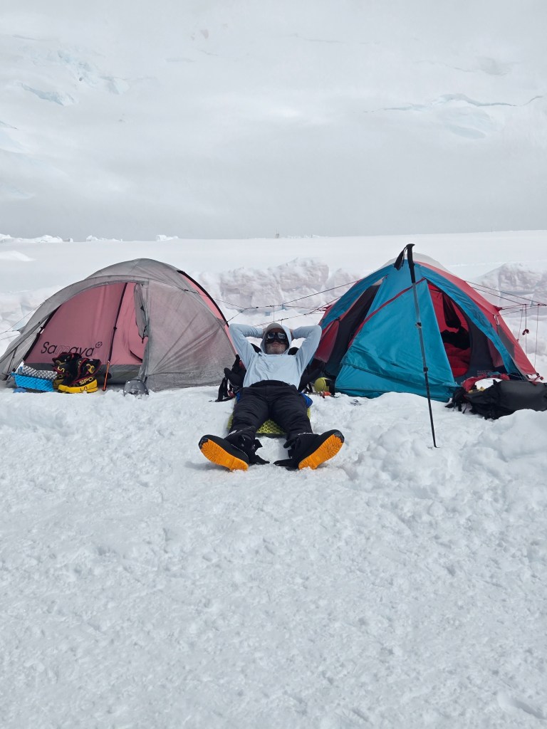 I have my hat, my beanie, my gloves, my muff, my harness, in one pocket. If those things aren’t on me, that’s where they are. My phone, Kindle, glasses, sunglasses, coffee sachets, Nuun, toothbrush, in a different pocket, with my spork. My satellite phone hangs from the ceiling. Cup, plate, water bottles, pee bottle, charging chords, beside my sleeping bag. Down coats, trousers near the top of the sleeping bag – easy to use to prop yourself up when resting in the tent. My food – snacks- are buried outside in a trash bag. Stops them melting. Crampons and ice axe are beside my walking pole outside – the pole will be the marker if they get buried. My boots, and backpack stay in the vestibule at the front of the tent.