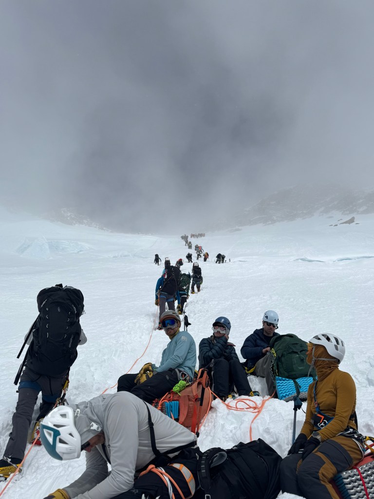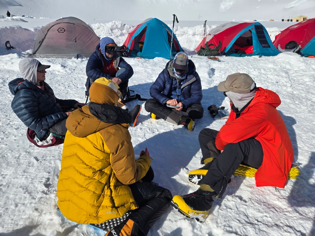 We did not move today. The view from Dominic, and the Park Rangers was the avalanche risk was too high. Spirits sunk at 7:30 a.m when Dominic came to the tents to share the news. Not unexpectedly, no snow had moved overnight. The obvious expletives were heard being mumbled along our line of tents. So we got up at 9:30, not that anyone had gone back to sleep, and chatted, with bowed heads, over a bowl of granola. Dominic said there’s still 1 more chance on Saturday. So we’re down to our last chance. Groundhog day. This is our 10th day at Camp 3, and our 6th weather day.