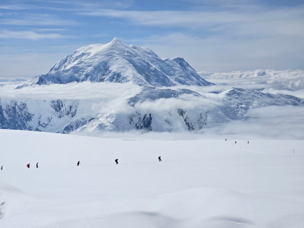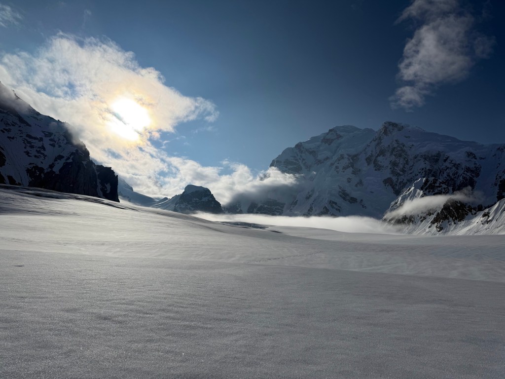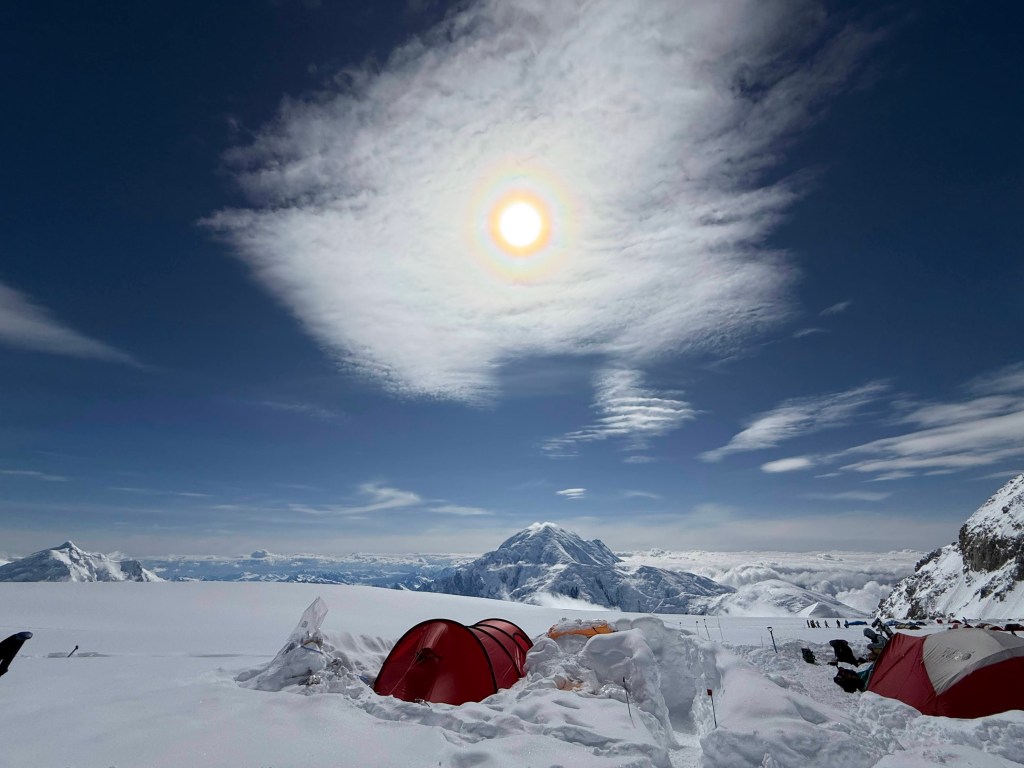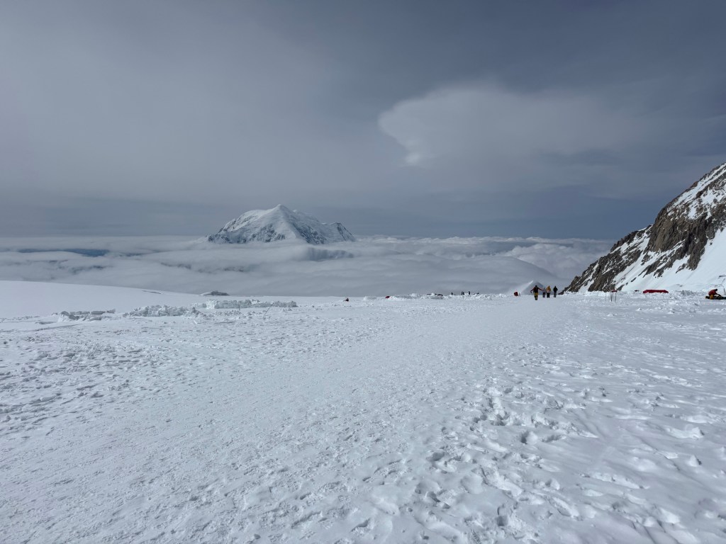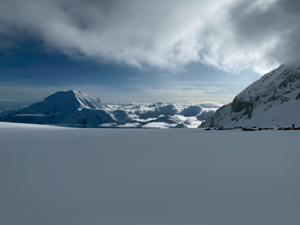 The rest of the day was walking, reading, podcasts, chatting, and enjoying the views. Everyday it’s different as the winds and the clouds give us different aspects of Foraker, and Hunter, and then a smaller replica of Hunter far beyond it called Mt Thunder. And the clouds, incredible, and were looking down on them. Thankfully we have this amazing view to gaze at, as we could be snowed in, or in a whiteout, or just surrounded by grey low level clouds. Having the view, the blue sky and looking down at the clouds is kinda weird, as one hand the views and visibility are great, but we are not moving. It feels like we should be! You literally have to remind yourself that it’s the wind up at 17,000 and above that is the issue.