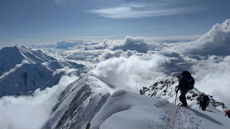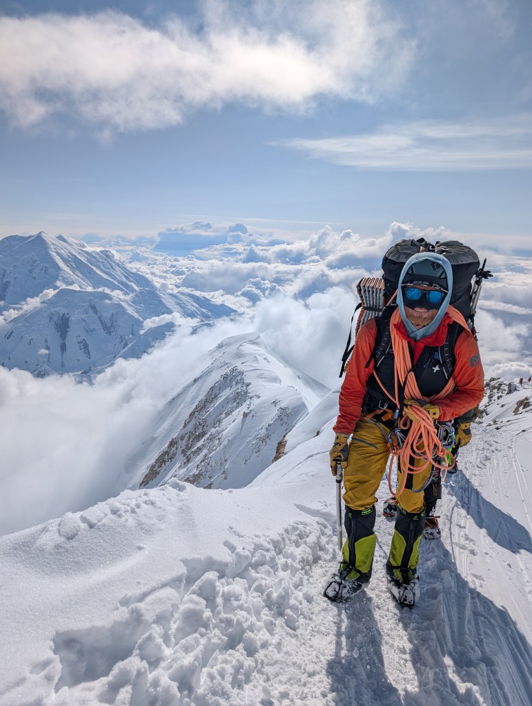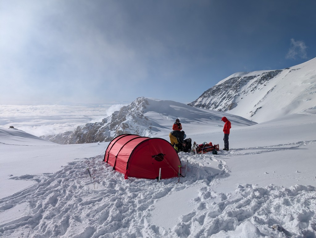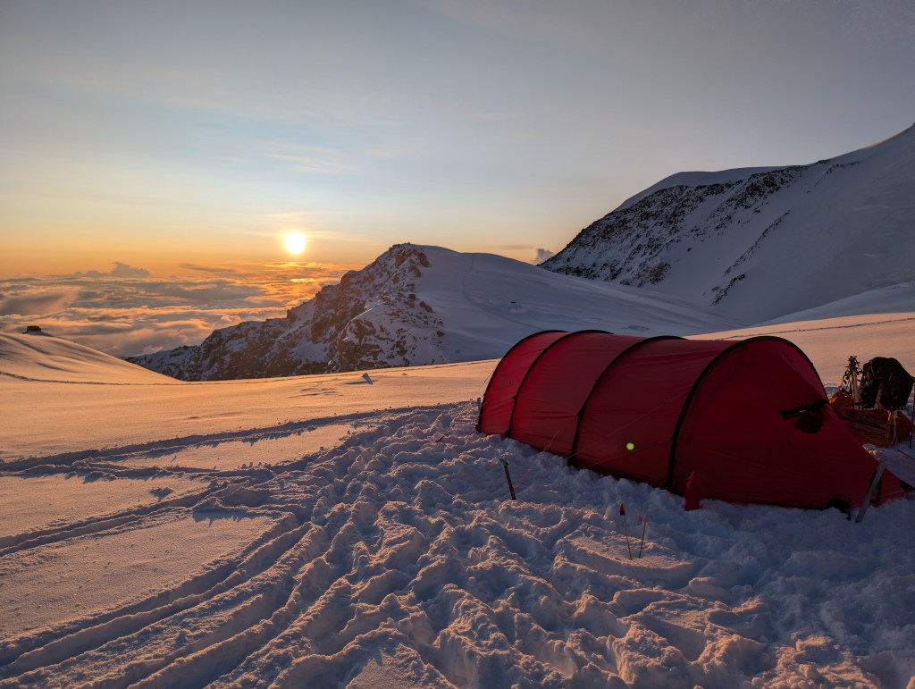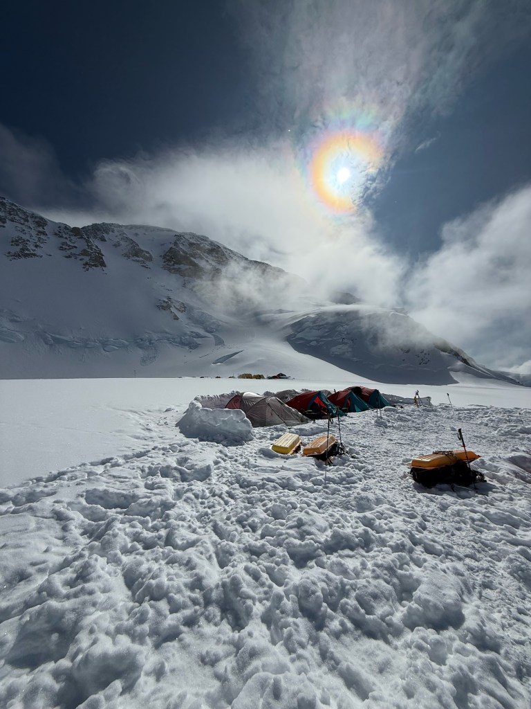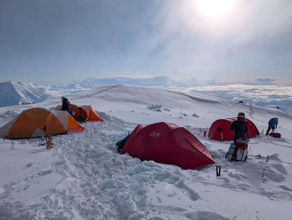The rest of the day was walking, reading, podcasts, chatting, and enjoying the views. Everyday it’s different as the winds and the clouds give us different aspects of Foraker, and Hunter, and then a smaller replica of Hunter far beyond it called Mt Thunder. And the clouds, incredible, and were looking down on them. Thankfully we have this amazing view to gaze at, as we could be snowed in, or in a whiteout, or just surrounded by grey low level clouds. Having the view, the blue sky and looking down at the clouds is kinda weird, as one hand the views and visibility are great, but we are not moving. It feels like we should be! You literally have to remind yourself that it’s the wind up at 17,000 and above that is the issue.