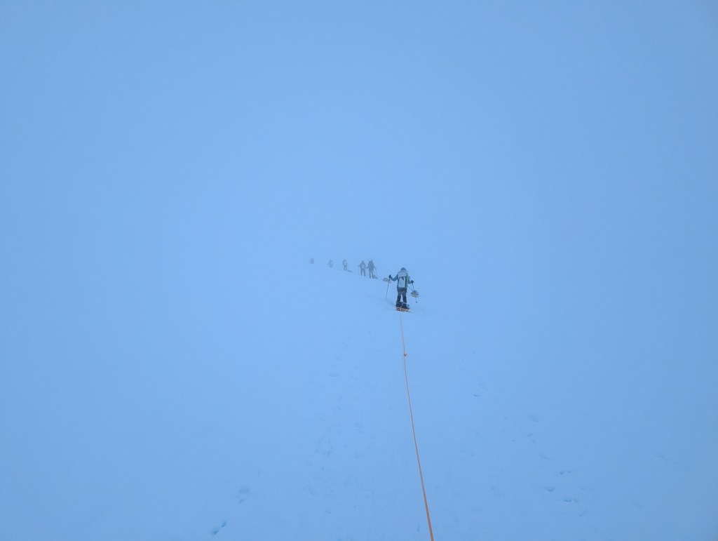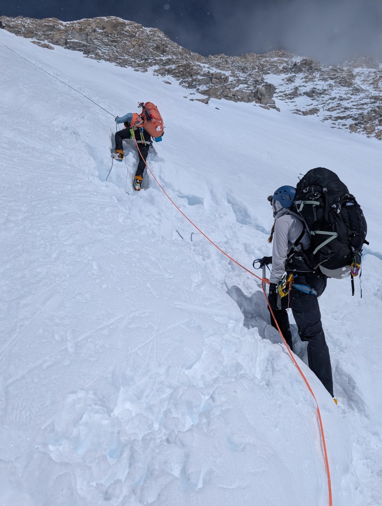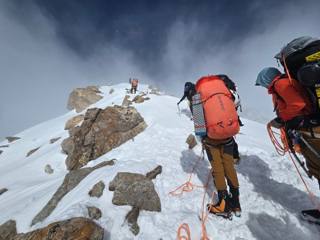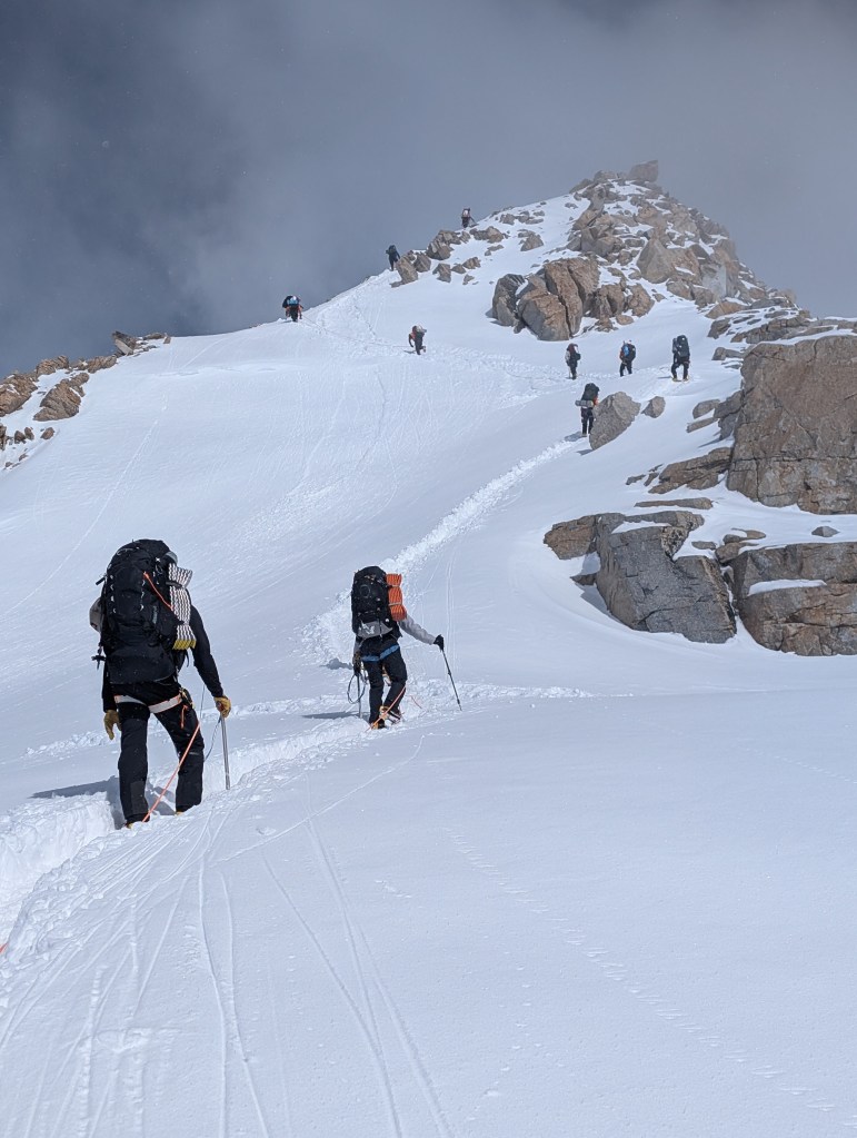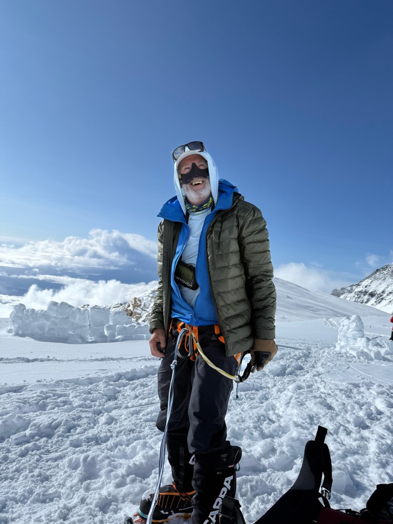 Shortly thereafter, it was a feast of bagels, cream cheese, and bacon. A few hours of rest, followed by 2 episodes of Clarkson’s farm season 4, and then a refresher in uphill walking techniques in crampons with Dominic. I hate walking side step, but on steeper ground it provides some relief from the normal duck step. Doing either in crampons, and avoiding stumbles or slashing one’s gaiters, does necessitate some practice. My legs haven’t done either since late November in Antarctica.