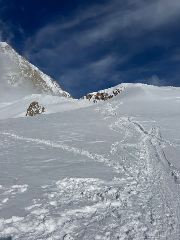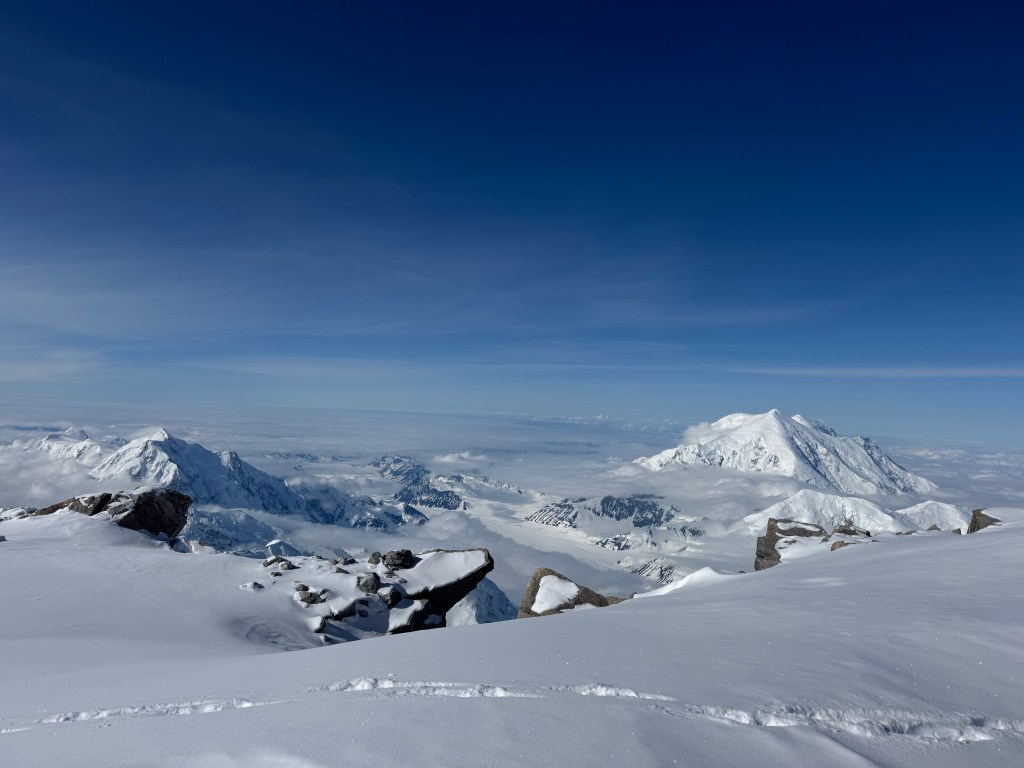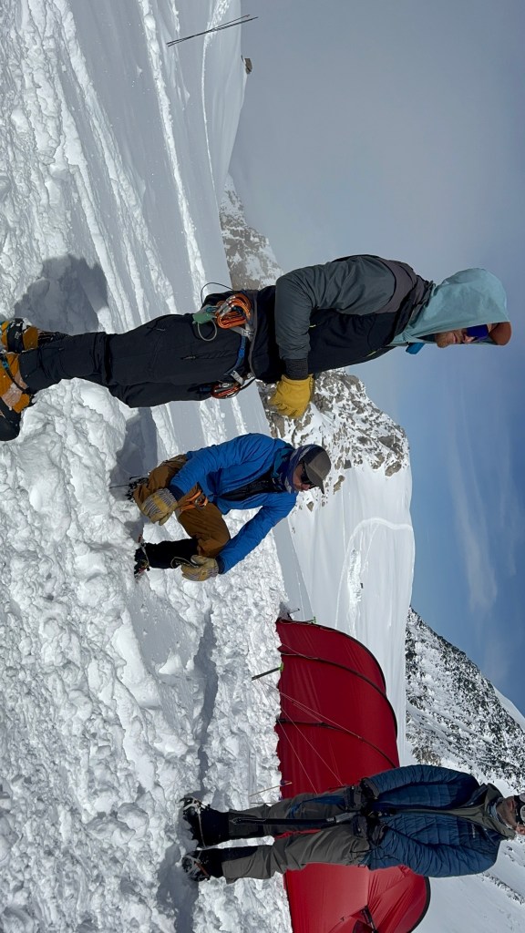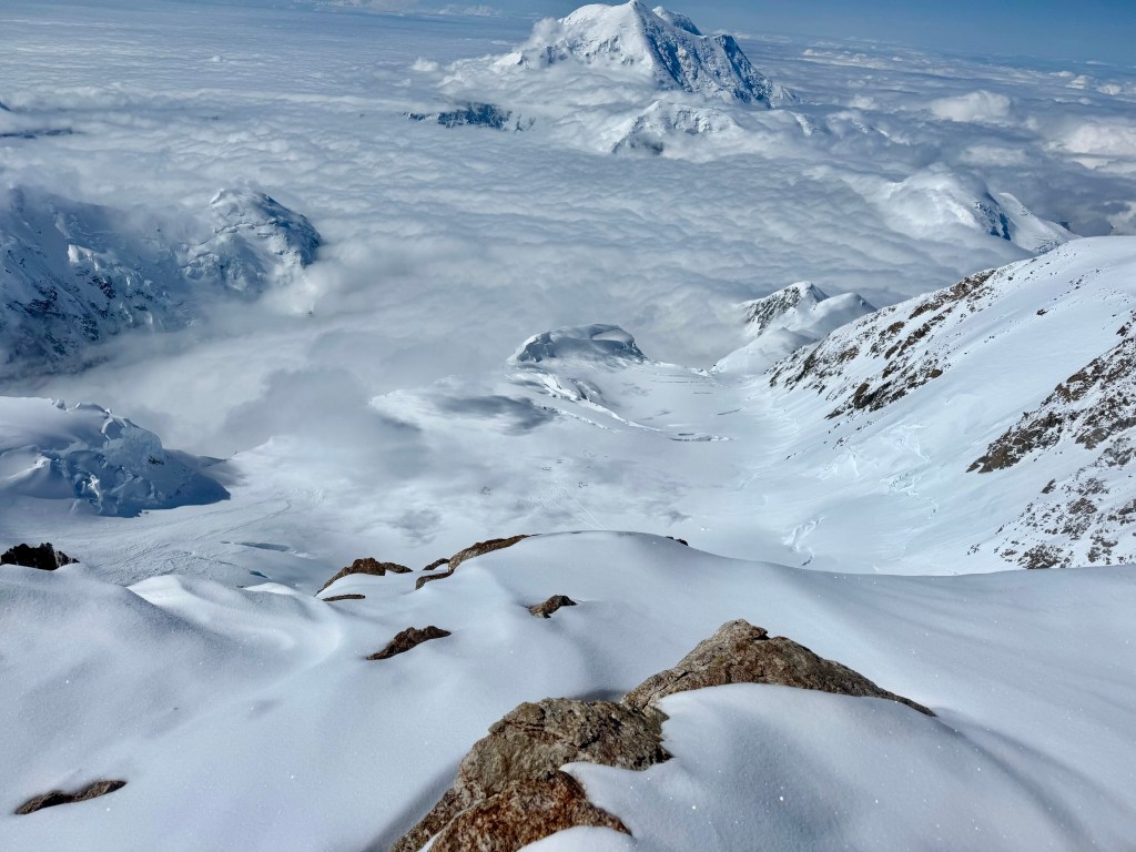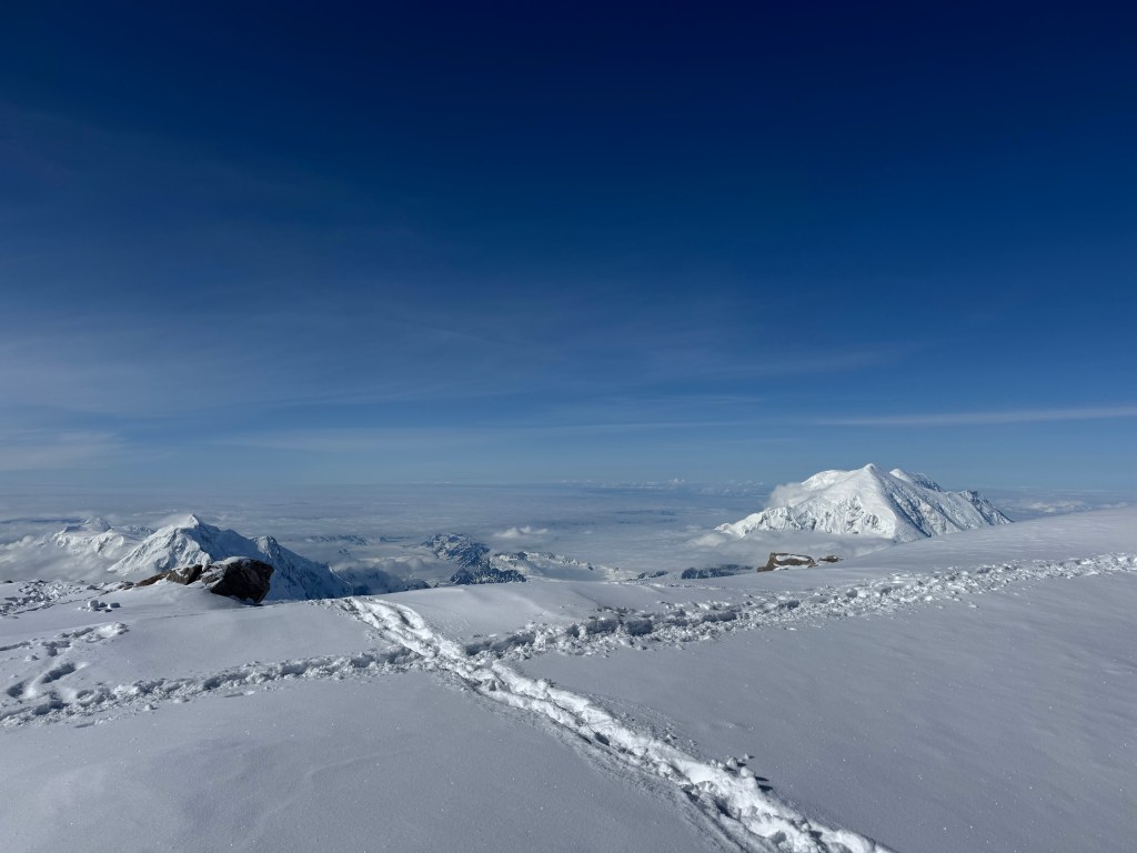 Steep falloff’s on both sides, with Mt Foraker, etc to the south, and the Peter glacier to our north. The vastness of the Alaska range is incredible, with mountains in all directions. What a privilege to see this. As we admired the views, and ate some snacks, Dom, Ben, and Mike buried the food and other stuff we brought up.