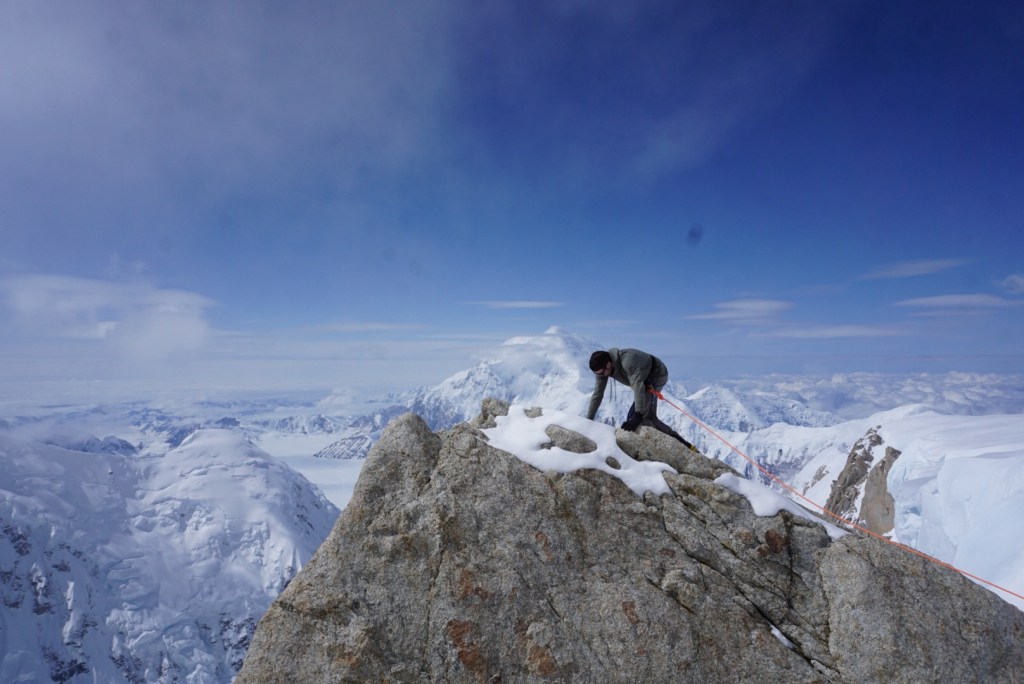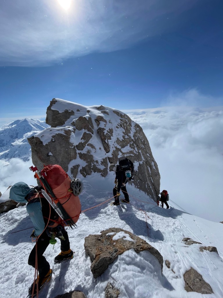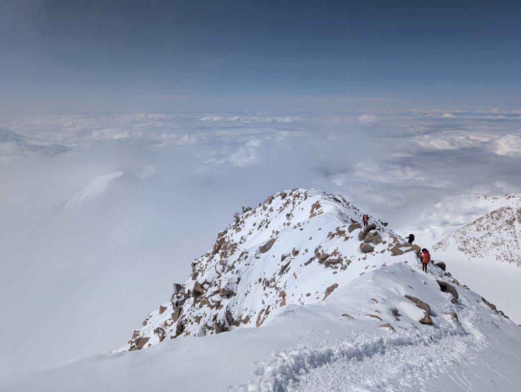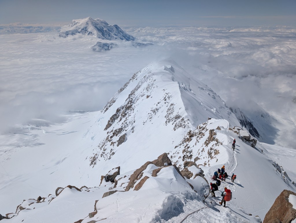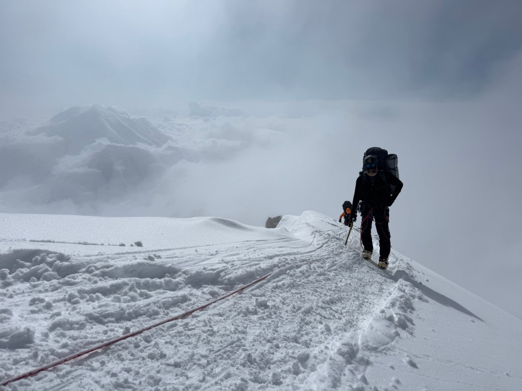 Steep falloff’s on both sides, with Mt Foraker, etc to the south, and the Peter glacier to our north. The vastness of the Alaska range is incredible, with mountains in all directions. What a privilege to see this. As we admired the views, and ate some snacks, Dom, Ben, and Mike buried the food and other stuff we brought up.