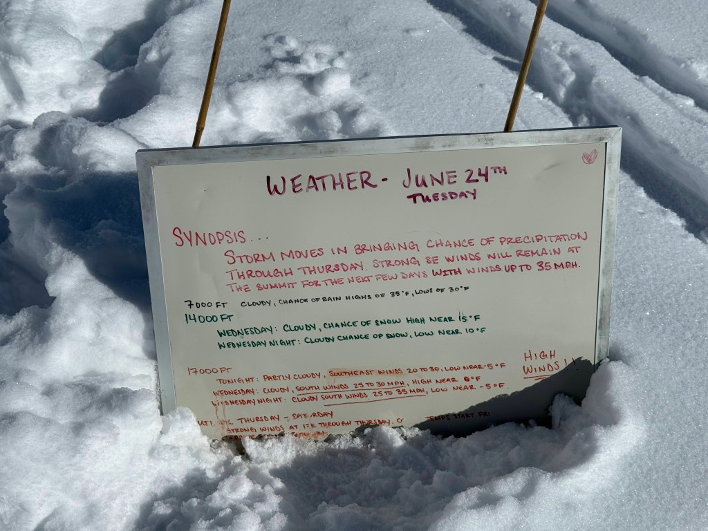 As I mentioned yesterday a team from AMS did leave and headed to 17,000. Dominic doesn’t like the weather so no move. At dinner he shared that maybe a window will open on Tuesday, but there’s a better chance on Wednesday. He has some weather experts back in Seattle, and a guy in Pennsylvania that he trusts. In addition, there are regular updates from the Park Rangers, and there is a team stationed her at 14,000. We have until Sunday, that’s when our permit expires. I really hope we don’t wait that long!