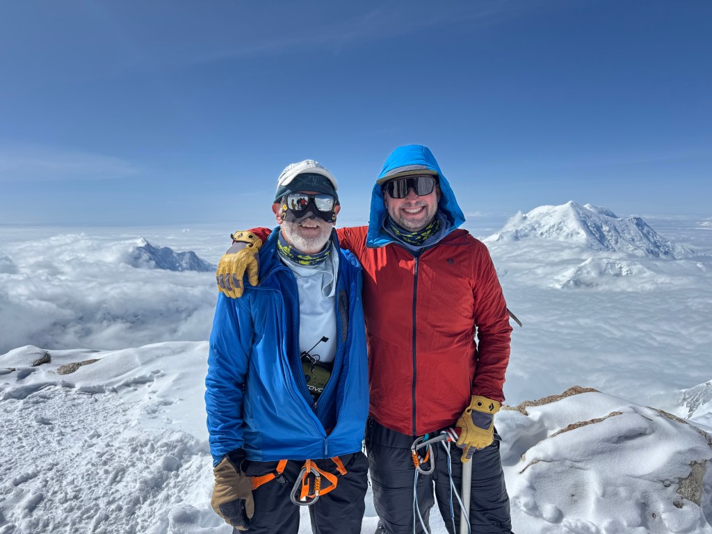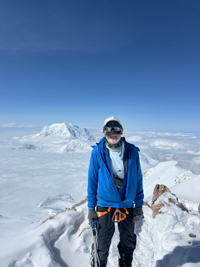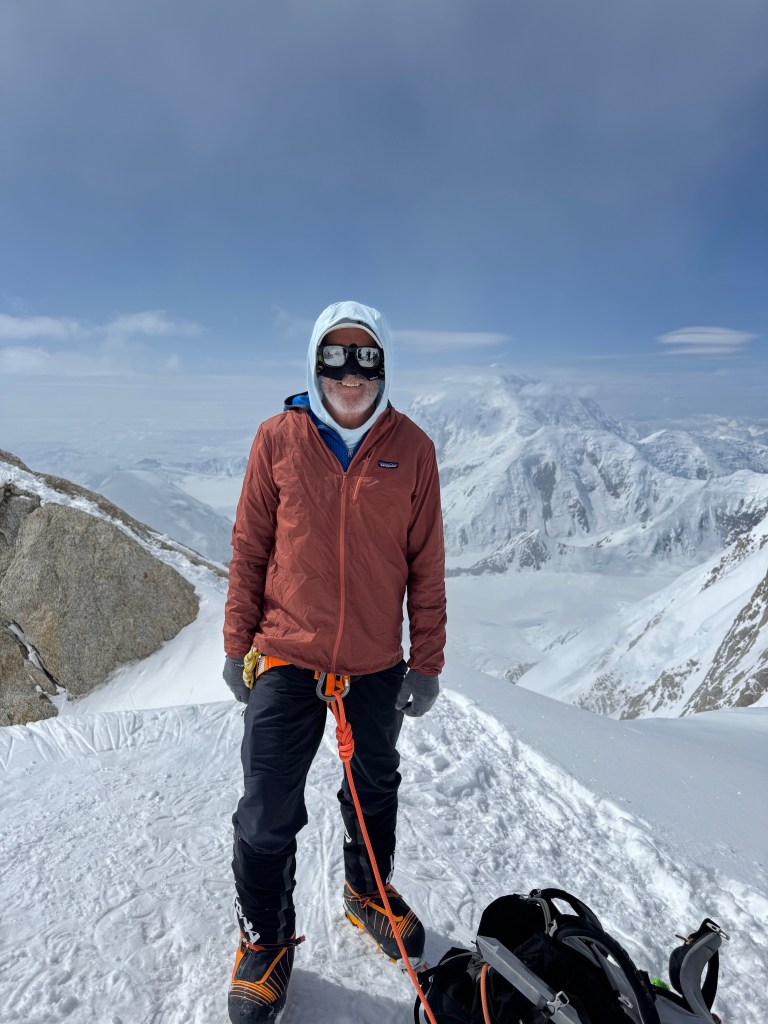 The guides dug up our cache, and we loaded up to head to Camp 4, at 17,200 feet. We had no idea what was ahead. We were about to traverse the West Buttress. The first section was a steep scramble up to Washburn’s Thumb – named after the famed climber and photographer Brad Washburn who established the route after photographing Denali from his plane back in time. Washburn’a Thimb may have looked insignificant from way down in Camp 3, but not now! On this section, Ben, our guide and rope leader, slipped, but quickly self arrested! I discussed this with Andrew later in the day, and this stumble had a similar (but silent) affect on both of us. It definitely increased our anxiety, making breathing difficult. I remember thinking I can only half fill my lungs, I have a cramp in my lower chest! After the scramble, there was a short section of fixed lines. At this point there was only one group ahead of us, so the snow was not packed, adding another vector to the challenge. The route was a mix of snow and rock, and rock and crampons aren’t great. After the fixed lines we were on the ridge. The exposure on both sides was something. Having said that, it was incredible. Steeply down below our right side was Camp 3. For days we had looked up at this ridge, with no knowledge of what it was like. Thankfully the route was passable. It was also clear why doing this ridge in the wind was a no-go. We walked for a couple of more hours on this ridge, occasionally having to scramble over rocks, which is quite different whilst wearing crampons. This section, which gained us about 1000 feet, was physically tough. We reached Camp 4 at 7:00pm. This was later than expected, due to the time lost earlier in the day on the lower sections. Then it was the normal routine. Establish camp – shovel out a flat platform for the tents, erect the tents, assist with the Posh and the latrine, unpack the backpack, blow up your air mattress – which is no fun at 17,200 feet -. Given the significant drop in temp, it was time to bring all layers into the tent, and keep your boot liners, socks, all gloves, all layers, and water bottles in your sleeping bag. The guides boiled water, which takes a lot longer at 17,000 ft, and we had a Mountain House dehydrated dinner in our tents. My yellow curry with chicken was quite tasty. I was tired. So was Andrew, and as it turned out, so was everyone else. It had been a long day, tough climb, wildly exposed. Nonetheless, it was exciting to be here, it felt good, to be within a day’s climb of the summit.