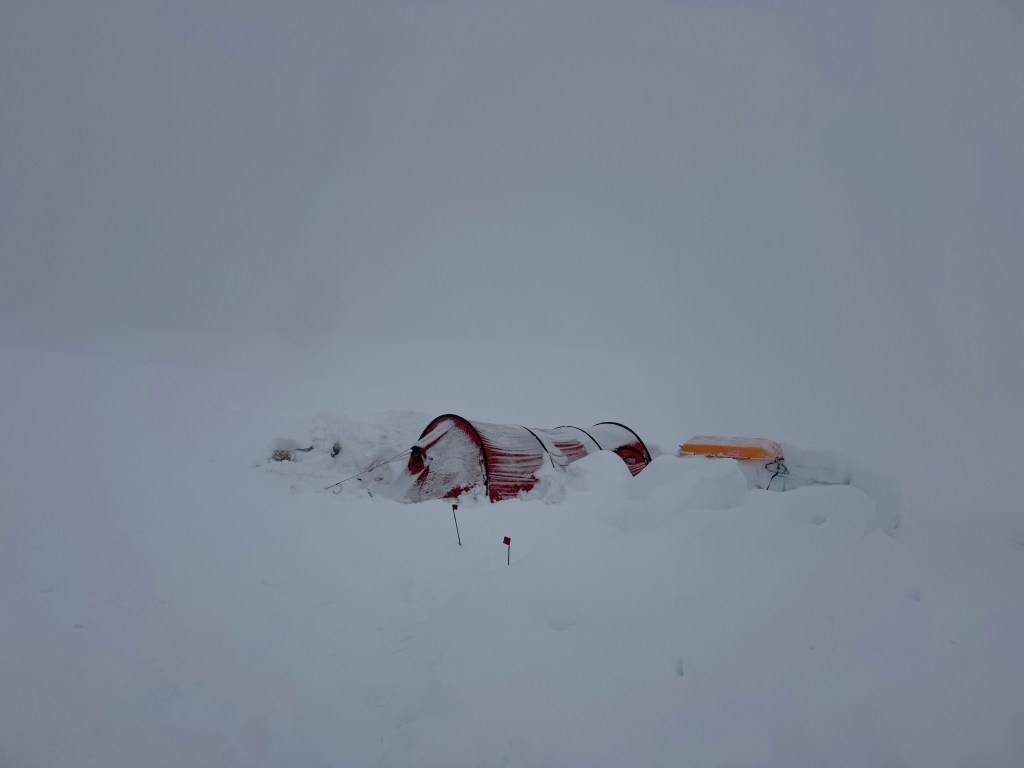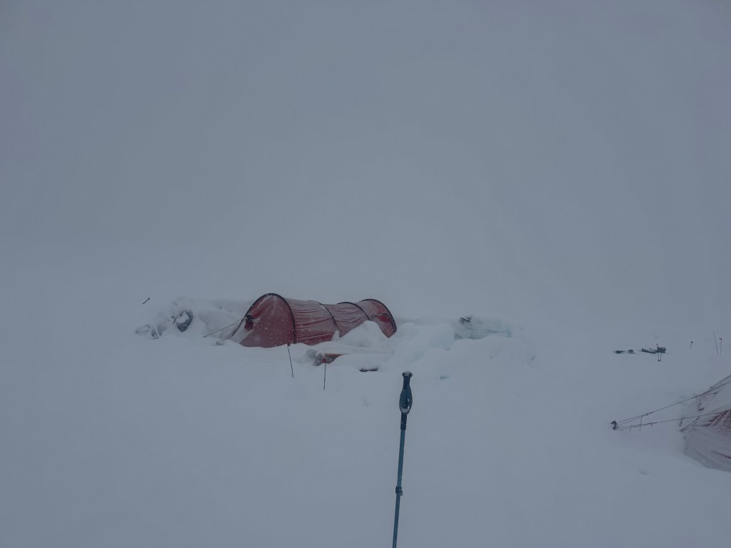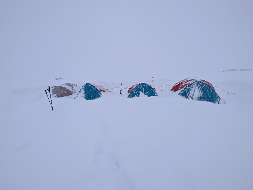 Before went to bed last night we shoveled snow from around the tent. The slow steady snowfall was accumulating. Seemingly a build up around the tent can result in suffocation, unlikely I’d say, but why take a chance. I’m not that bored….yet! During the night the guides got up and cleared all round the tents again. I woke/got up at about 9, and there was another 6” or more around the tent. It snowed all day. It was expected to stop at 2, at 4, and finally stopped at 6pm. I guess we had about 20” accumulation. We were in a complete whiteout for most of the day, the other tents around camp being barely visible. At this stage, it is getting boring. Today we could not leave the tents, so snooze, read, chat, snooze, read…….. Some people – thankfully not Andrew – , and other’s little idiosyncrasies, are becoming irritating, even annoying in some cases. However, it is only a few more days (one way or the other), so no need to upset the applecart.