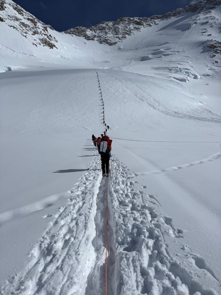 Today we moved food for our summit attempt to 16,200ft. We brought 3 days of food, that was snacks, 3 dehydrated dinners and breakfasts. This would be all we needed when we’d try for the summit. We would not come back up unless, or until, there was a 3 day weather window to attempt to summit. RMI has a (permanent) cache at 17,000 ft, with more food, tents and cooking gear. This would minimize our overall carry to 17,000. We travelled about 2 miles total – doesn’t seem that far- but went 2,000ft up and down. So, yes it was, steep. Literally straight up!