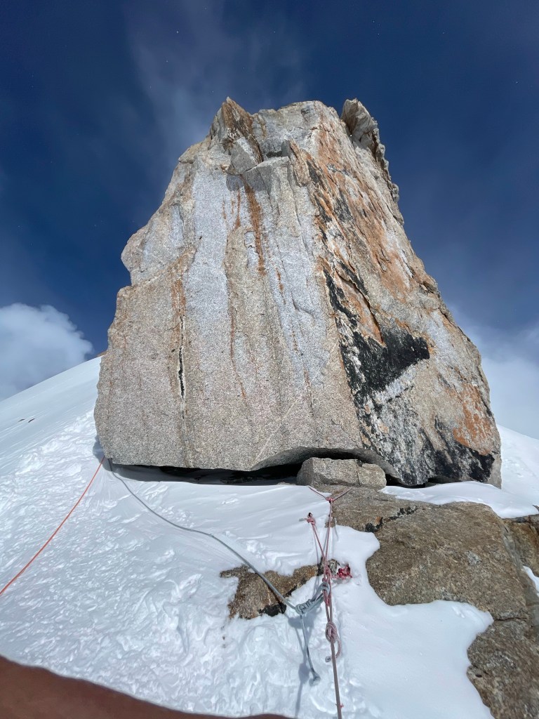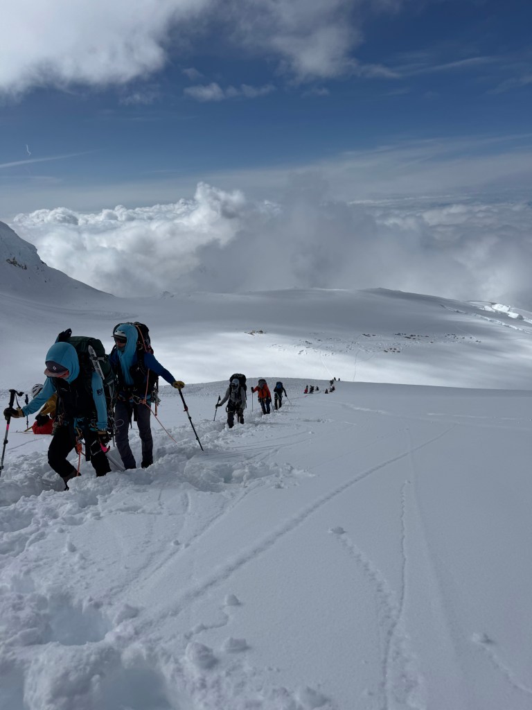 We had about 1,200ft of steep up hill, until we met the bergschund, and we transitioned to fixed lines. On the steep uphill section it’s important to kick in with your crampons to ensure a good fitting, one foot, rest, kick with the other foot, rest, and on, and on. We took one break on the way to the fixed lines. The camp below was getting smaller, but the view was just getting better. As we approached the bergschund, Dominic dug out a shelf for us to rest. We would leave our walking poles here, as they are no help/a hindrance on the fixed lines on the fixed lines. Fixed lines are used where the slope is very steep, and extra assistance is needed. (We connect to a fixed rope (line) with an ascender, which provides an extra connection point to the mountain. The ascender slides on the rope, and can’t move backwards. However, you don’t (or are not supposed to) use the ascender to pull yourself up).