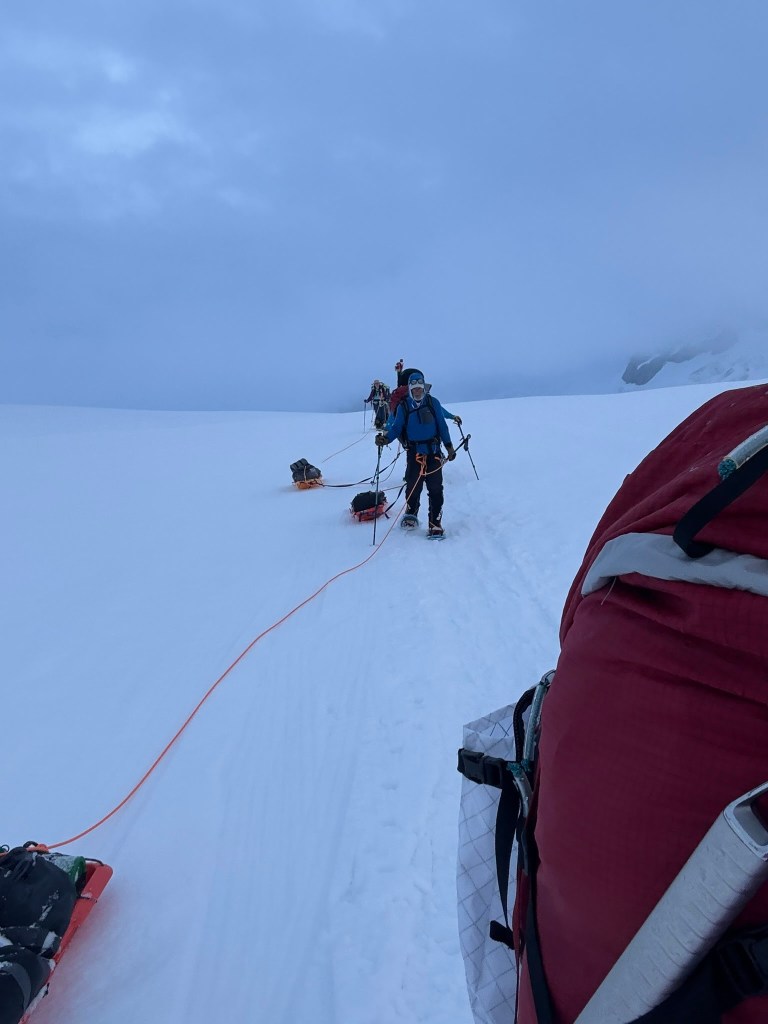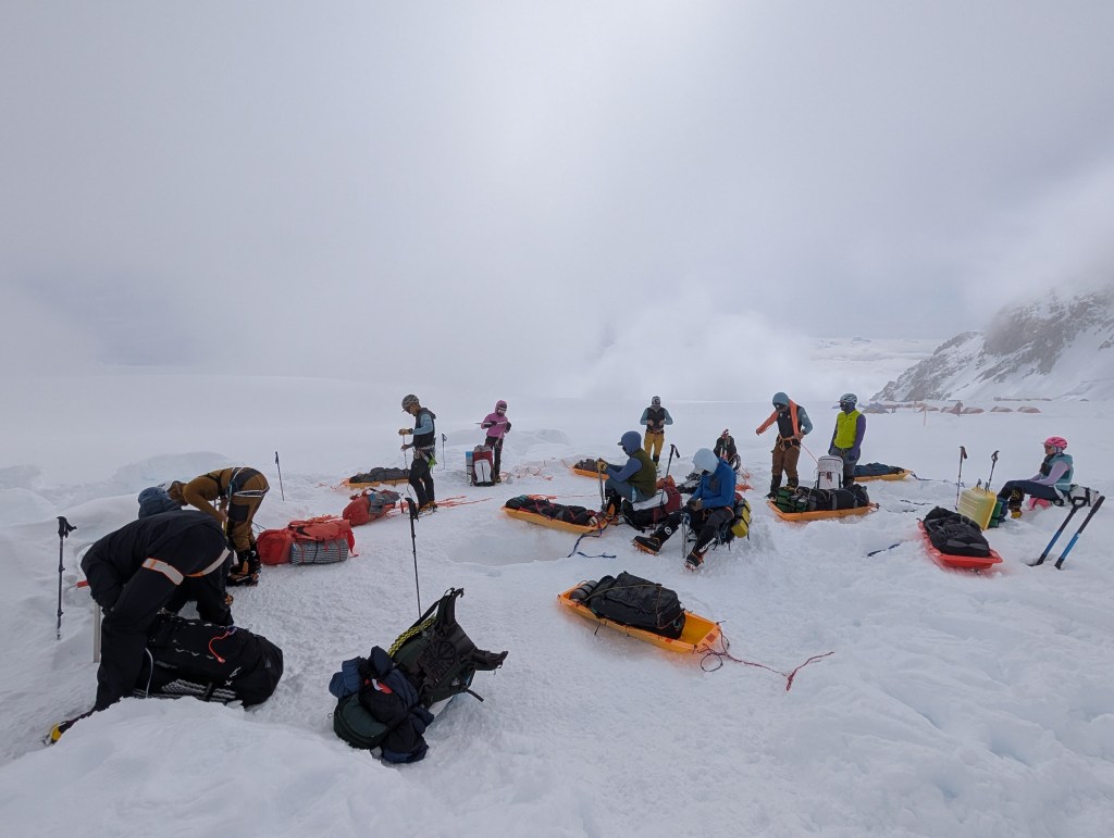 We stopped at Camp 1 to pick up some more cached gear. Bags got heavier again. We criss-cross crossed the glacier to avoid known crevasses. Dominic had been here many times and he saw or sensed where the dangers lay. The snow turned to rain, and the underfoot snow was soft and slushy. The slushy snow was sticky for the sleds. Just keep going, it can’t be much further. At the end of the trail, you have to go about 500 feet uphill, on what’s known as Heartbreak hill. So hard! I remembered going in the opposite direction as we set off 19 days ago. The downhill section then seemed nowhere as steep as it was now going up. Back then I had no idea of what the adventure, the highs and lows the intervening 19 days would hold. I recalled how we passed teams, and they too seemed zombie like, and I had no idea why. How could they be so grumpy and disengaged after completing their adventure? Now I knew!! Just get me to the airstrip.
