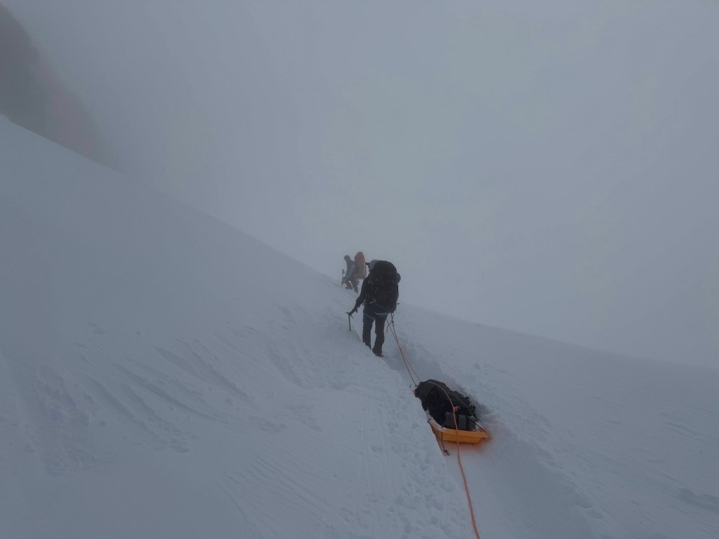 We had 2 dodgy sections ahead, Windy corner, and Squirrel hill. We now walked with a heavy sled between us. As the last man on the rope team I had no sled behind me. My role was to prevent the sled on Adjoa, ahead of me, from moving to the left or right, that could cause her to be pulled off the track, and off the mountain. I achieve this by keeping a very tight line, effectively trying to pull her back towards me. The trail and conditions were significantly different than the last time we descended back to Camp 2. The snow was deep, and relatively untrodden. At Windy corner there is steep exposure on the left, and the sleds slide strongly in that direction. On the right there is the risk of rockfall, so we once againhad towear helmets on this section. I always wonder what good my helmet would be if I was hit by a significant rock!!!!