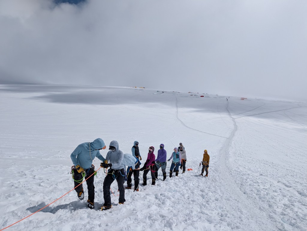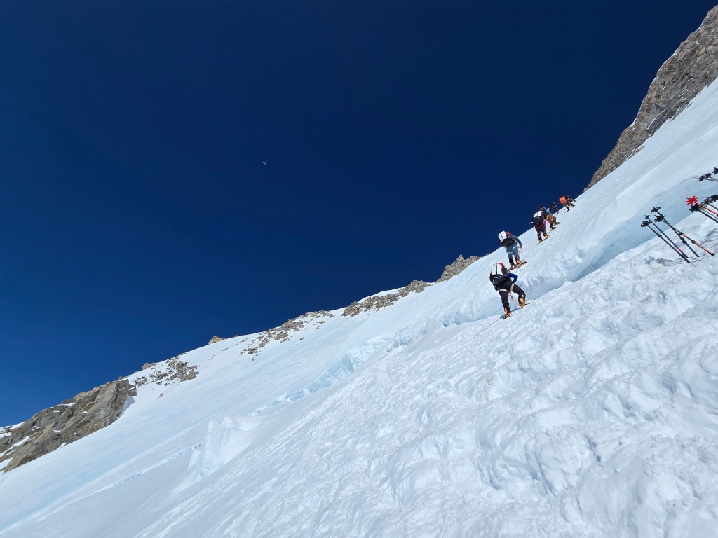 We had about 1,200ft of steep up hill, until we met the bergschund, and we transitioned to fixed lines. On the steep uphill section it’s important to kick in with your crampons to ensure a good fitting, one foot, rest, kick with the other foot, rest, and on, and on. We took one break on the way to the fixed lines. The camp below was getting smaller, but the view was just getting better. As we approached the bergschund, Dominic dug out a shelf for us to rest. We would leave our walking poles here, as they are no help/a hindrance on the fixed lines on the fixed lines. Fixed lines are used where the slope is very steep, and extra assistance is needed. (We connect to a fixed rope (line) with an ascender, which provides an extra connection point to the mountain. The ascender slides on the rope, and can’t move backwards. However, you don’t (or are not supposed to) use the ascender to pull yourself up).