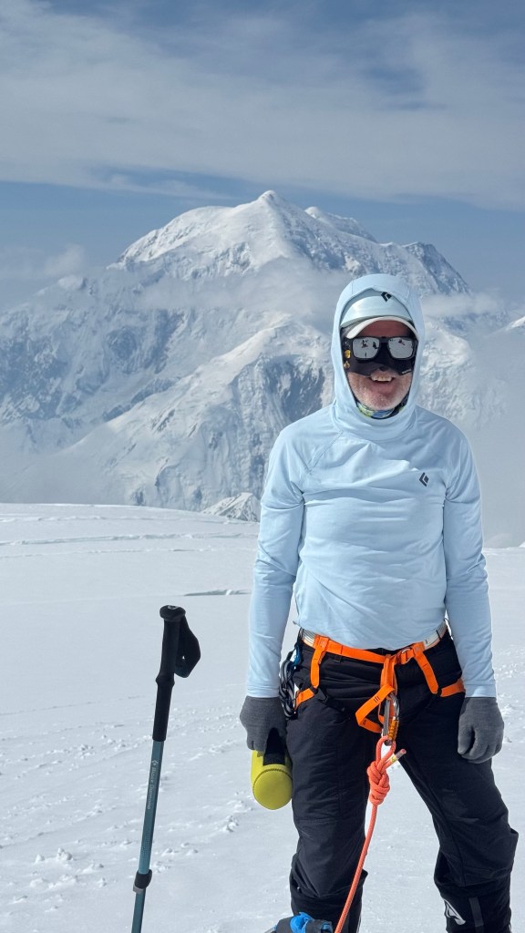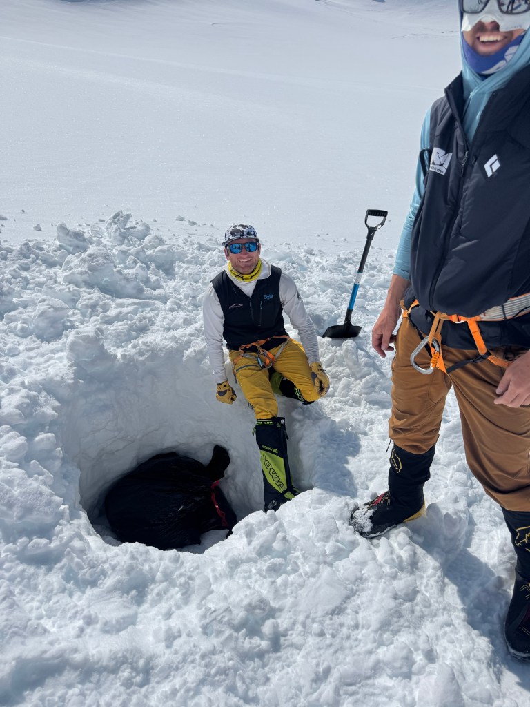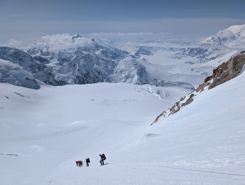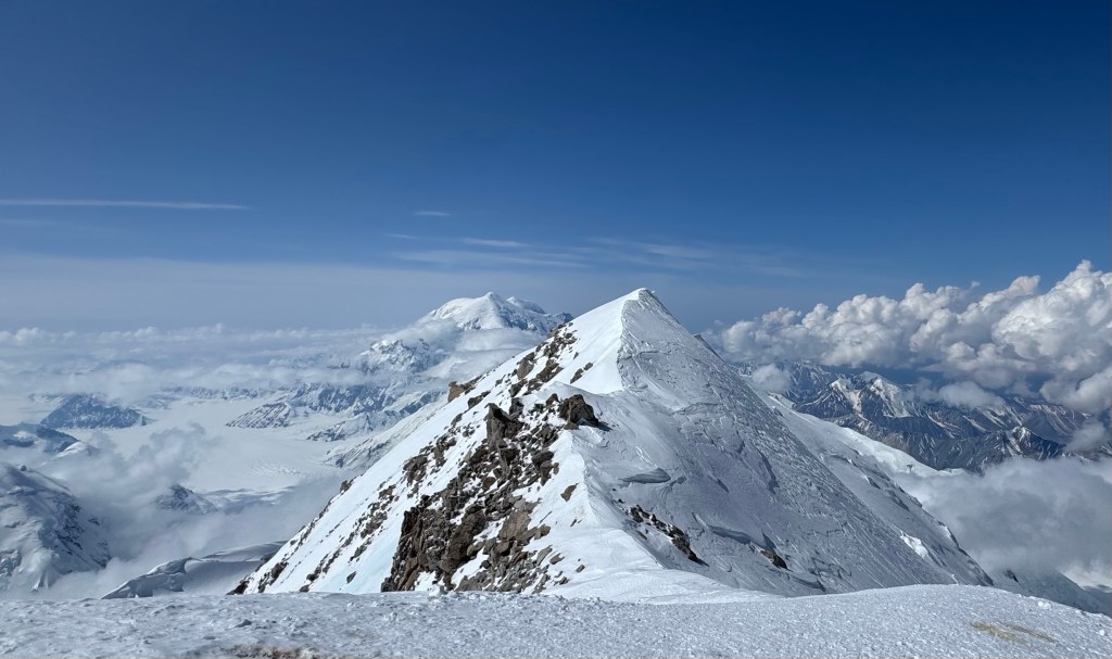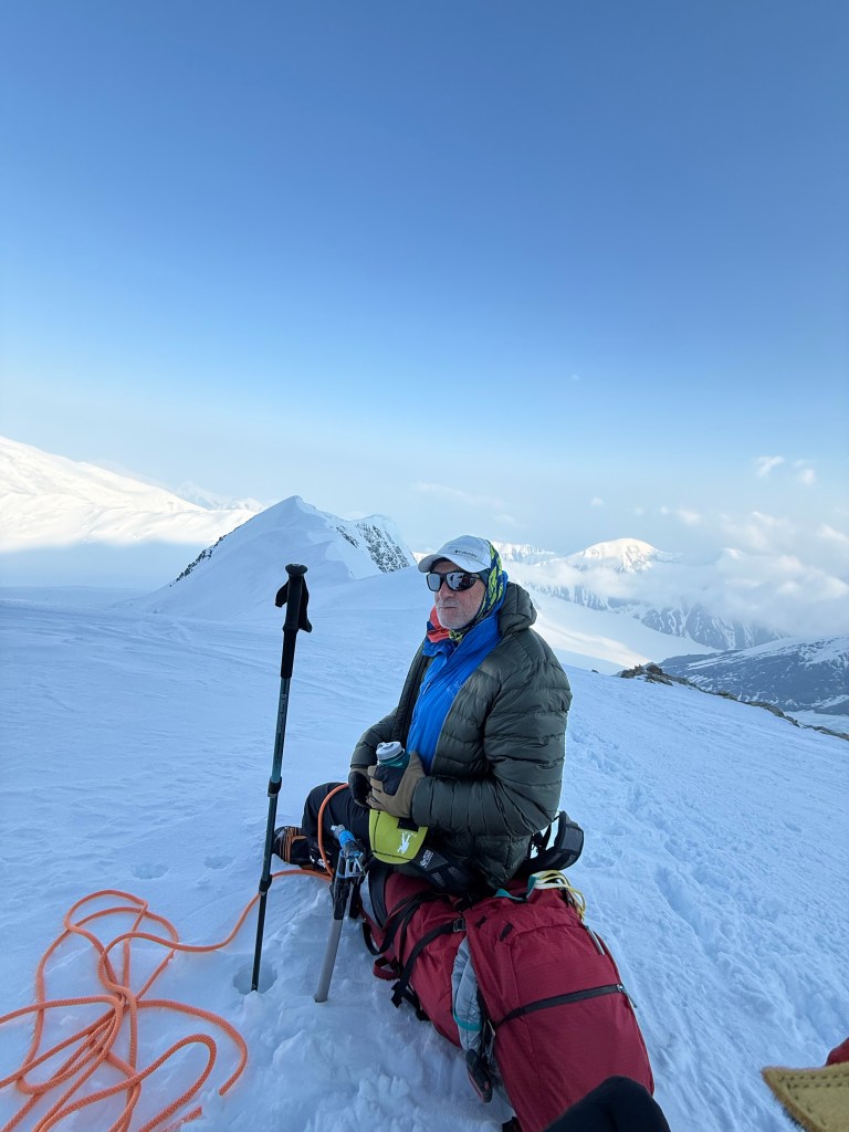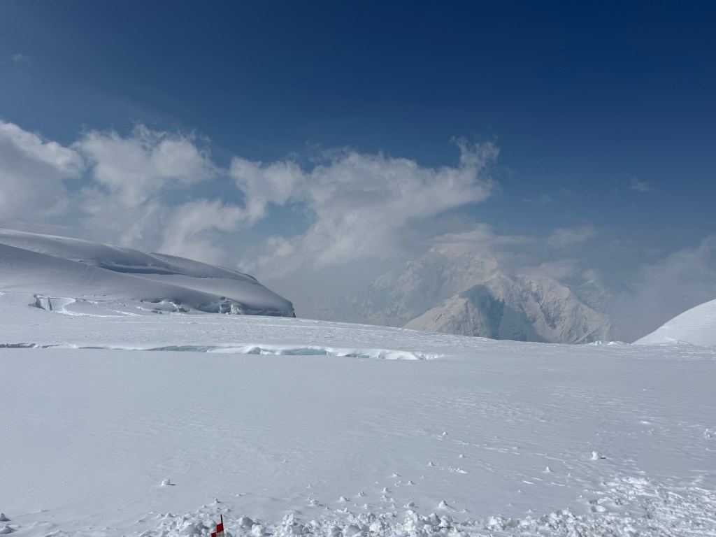 Steep falloff’s on both sides, with Mt Foraker, etc to the south, and the Peter glacier to our north. The vastness of the Alaska range is incredible, with mountains in all directions. What a privilege to see this. As we admired the views, and ate some snacks, Dom, Ben, and Mike buried the food and other stuff we brought up.