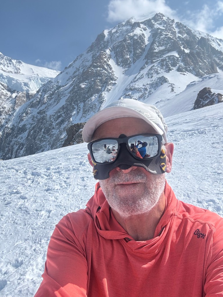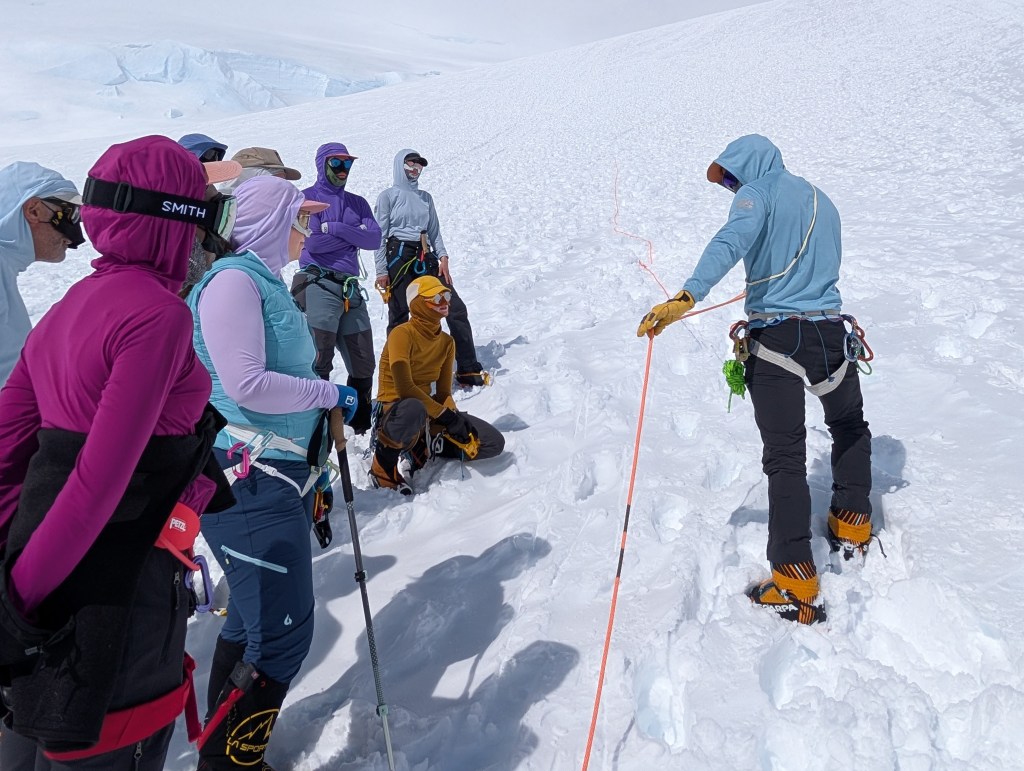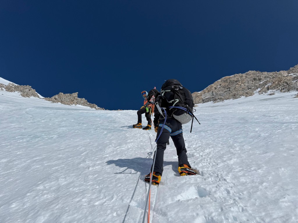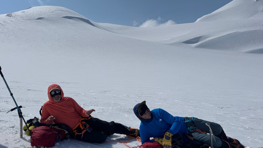 Shortly thereafter, it was a feast of bagels, cream cheese, and bacon. A few hours of rest, followed by 2 episodes of Clarkson’s farm season 4, and then a refresher in uphill walking techniques in crampons with Dominic. I hate walking side step, but on steeper ground it provides some relief from the normal duck step. Doing either in crampons, and avoiding stumbles or slashing one’s gaiters, does necessitate some practice. My legs haven’t done either since late November in Antarctica.
