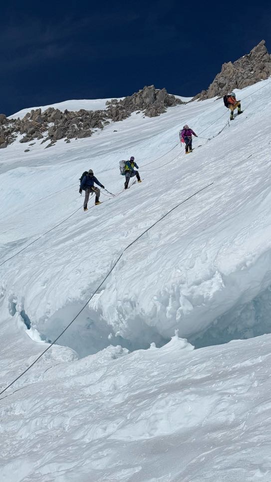 At 3:30 pm we were off to practice ascending and descending the fixed lines. It’s a while since most of us used a jumar, so the practice is really worthwhile, especially practicing how to unclip with heavy gloves on. Learning, and struggling, in real life, on the fixed lines is not an option. Nor is stopping and waiting as people struggle to unclip when on the steeper sections of the fixed lines.