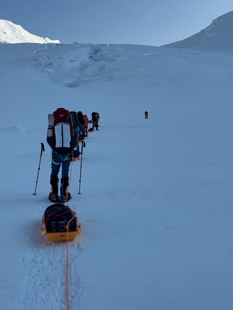 We took off on schedule and landed on the glacier about 12 mid-day. Base camp is deserted. Everyone left when the weather improved. The pilot said this was the best weather of the season. We immediately set up tents and rested. It was too hot to move. We had dinner at 5pm and discussed the plan. We would move out at 3am. We then discussed our packing strategy – on our backs versus sleds, how to rope up with the sleds, and how to rope the sleds to prevent them flipping us if we fell in a crevasse. The issue with flipping is that we may fall out of our harness. That’s bad, really bad! We also discussed ice axe arrest when pulling a sled, if one of the team dropped in a crevasse. This is most likely the leader, as we are all instructed to follow exactly his foot steps.