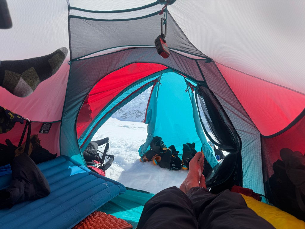 Dinner tonight is quesadillas. So far the food has been decent. Goal is to eat as much as you can. Take seconds if available. Also soup to start. Miso or some awful corn concoction. Soup goes in my mug. It means my soup tastes of coffeee, and my coffee of soup!9 hit the sack by 8 pm. There is a game of dice going on, but I got the sleeping bag and read my book, until my hand gets too cold. In bed I’m in a base layer, boxers, my down booties, my beanie and light gloves. Nights haven’t been so cold so far. Oh I forgot, earplugs and an awesome face mask that completely blocks the light. Tomorrow we go back downhill to collect our cache, to bring it up to Camp 2.